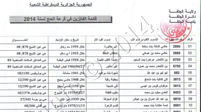 تنشر جريدة "الجلفة إنفو" الإلكترونية نتائج عملية قرعة الحج التي أجريت صبيحة اليوم السبت بقاعة سينما الكواكب -سابقا، و المتعلقة ببلدية الجلفة، حيث ضمت القائمة 80 فائزا لأداء فريضة الحج لموسم 2014 بالإضافة إلى 08 أسماء في القائمة الإحتياطية..يرجى النقر على الصور لمشاهدة أوضح يرجى النقر على الصور لمشاهدة أوضح