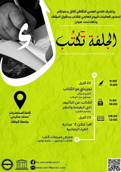 بمناسبة اليوم العالمي للكتاب وحقوق المؤلف، ينظم "النادي العلمي آفاق" نشاطا بعنوان "الجلفة تكتب" وسيكون النشاط على يومين وفقا للرزنامة الآتية:اليوم الأول: الأربعاء 22 أفريلالندوة الأولى بعنوان "تجربتي مع الكتاب"، يحكي فيها كل شخص عن السياقات التي ولد فيها كتابه، وعن المعوقات والمحفزات التي لاقاها.الندوة الثانية بعنوان "الكتاب، من التأليف إلى الطباعة والنشر، خطوات يجب على كل مؤلف أن يعرفها.وستتناول الندوة:حقوق المؤلف: الملكية الفكرية.عقد النشر: الحقوق المادية والحقوق المعنوية.الطباعة: مراحلها ويكون فيها الشرح بالصور.وذلك إبتداءاً من 9:30 صباحاً بقاعة المحاضرات " الدكتور محمّد سايحي"اليوم الثاني : الخميس 23 آفريلمبادرة القراءة الجماعية "إقرأ لتكون" للموسم الثاني على التواليمعرض بيع كتب (لكتّاب محليين جلسات توقيع)