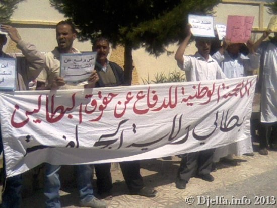 شهد مقر ولاية الجلفة اليوم الخميس وقفة احتجاجية سلمية دعا إليهاالمكتب الولائي للجنة الوطنية للدفاع عن حقوق البطالين..حيث نادى الشباب المحتج بحقوقهم المشروعة في العمل رافعين لافتات تضمنت مطالبهم، منددين في نفس الوقت بالمحسوبية و الرشوة من طرف الإدارة، و "الحقرة" التي يتعرض لها العديد من الشباب من طرف المصالح وعبر جميع الإدارات بدون استثناء.