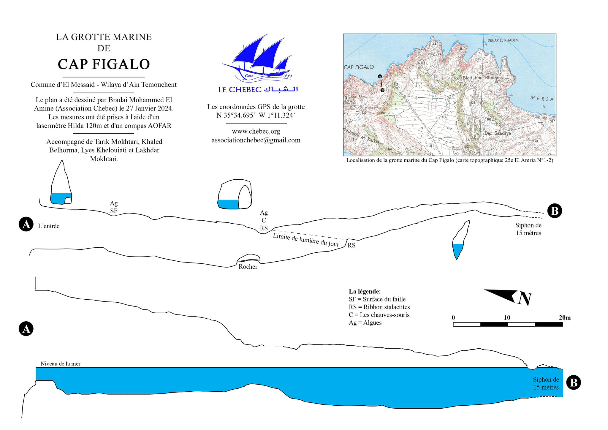 L'Association Chebec, une association culturelle basée à Oran, a récemment topographié la Grotte du Cap Figalo près de Bouzedjar, en Algérie. Mohamed Bradai, doctorant en Stratigraphie-Paléontologie à l'Université d'Oran, plongeur et explorateur chevronné, a dirigé cette exploration. La grotte, accessible en bateau sur 90 mètres, offre encore 20 à 40 mètres à explorer en plongée sous plafond, réservée aux plongeurs expérimentés. Trois poches d'air stratégiques rendent cette aventure unique, soulignant l'engagement de l'Association Chebec dans l'exploration, la valorisation, et la préservation du littoral.