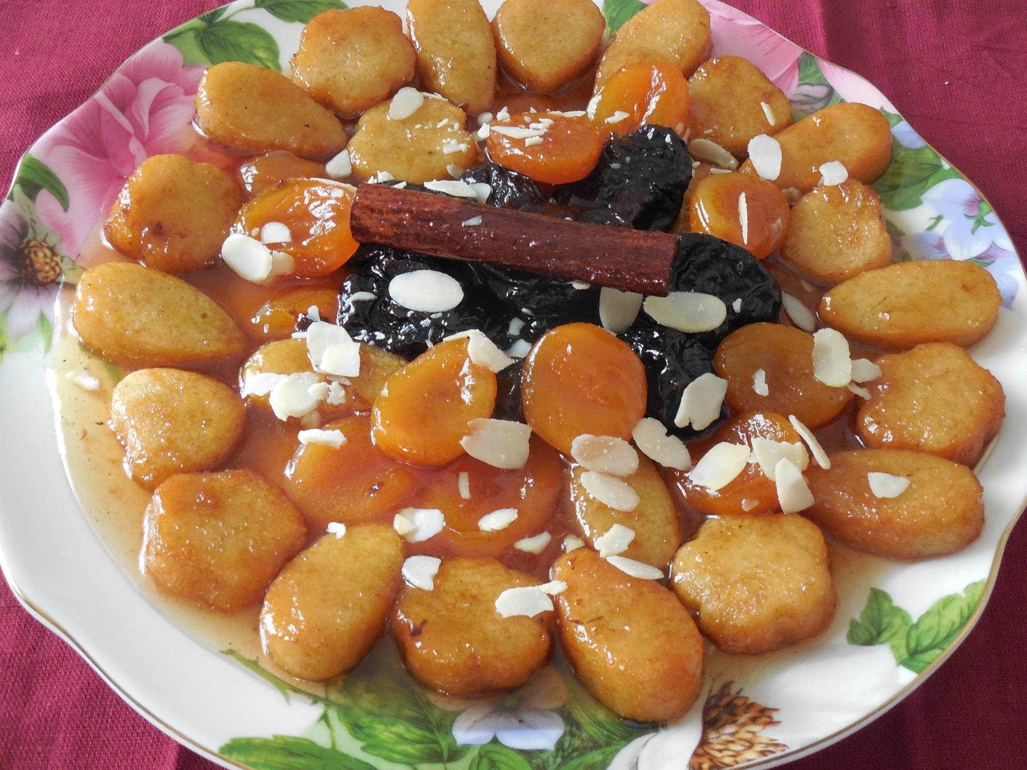 entre temps,passez les pruneaux, les abricots a la vapeur et placez les raisins secs dans l'eau de fleur d'oranger pour gonfler,
