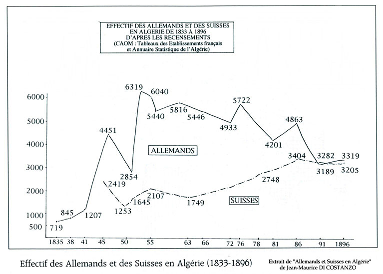 L’étude du graphique de « L’effectif des Allemands et des Suisses de 1853 à 1896 », bien que peu fiable, compte tenu des méthodes de recensement de l’époque, nous montre l’évolution de cette émigration; notamment les trois grandes vagues d’émigration : (1853-54) (1871-77) (1881-86), et les baisses d’effectifs qui les suivent. Celles-ci sont consécutives aux épidémies (variole, paludisme, choléra), sécheresse, insurrections, qui entrainent une mortalité supérieure aux naissances. René Mayer dans son ouvrage « Algérie : Mémoire déracinée » nous rapporte que « d’octobre 1853 à février 1854, la proportion de décès chez les adultes avoisine la moitié »… Ce qui entraina pour certains, une démotivation et le retour sans ressource au pays où l’accueil compte tenu de la situation politique n’a pas été des plus chaleureux. De plus les allemands ne semblaient pas s’acclimater à l’Algérie, ce qui explique aussi cette baisse de l’effectif en 1896, par rapport à la grande vague de 1853.