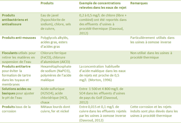 Ce tableau représente les produits chimiques potentiellement présents dans les effluents des usines de dessalement – Ecotoxicologie.fr, d’après les données de Dawoud, 2012 ; Morton, 1996 et UNEP, 2003