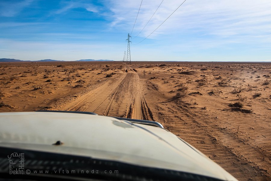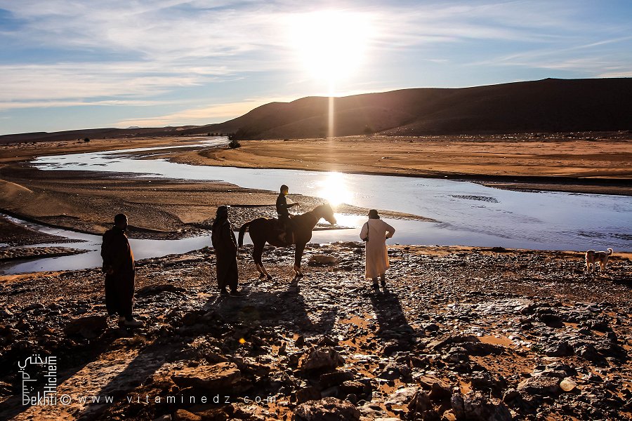 Après avoir repéré l’endroit grâce à Google Maps, nous constatâmes que le fort semblait enfoui sous le sable. Il était difficile d’imaginer ce qu’il en restait, mais cela ne faisait qu’attiser notre envie d’en savoir plus. Nous avons alors contacté Aziz, un habitant de la zaouia des Mouahdines, recommandé par des connaissances comme étant le meilleur guide pour ce genre d’expédition. Vendredi, à l’aube, nous avons pris la route depuis Tlemcen. Cinq heures plus tard, nous rencontrions Aziz après la prière d’El Joumoua. Avec son vieux 4x4, il nous conduisit à travers les pistes arides et sinueuses de la région, longeant l’Oued des Mouahdines, dont les eaux semblaient remonter le fil du temps.