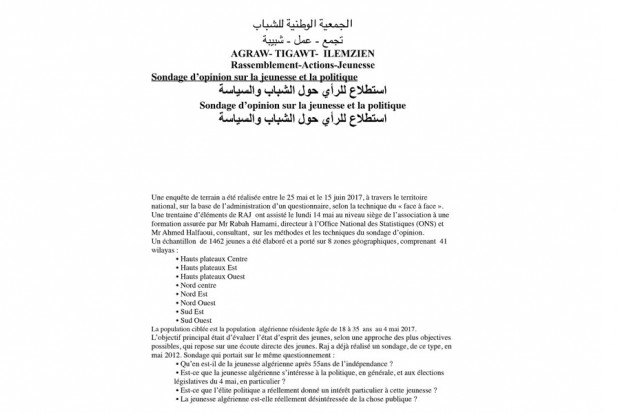 Ces chiffres, valables en 2017, fera remarquer M. Fersaoui, sont encore en deçà de ceux révélés lors d'un sondage similaire réalisé par le RAJ à l'occasion des législatives de 2012.Réalisé juste après les élections législatives du 4 mai dernier, exactement entre le 25 mai et le 15 juin, sur un échantillon de 1 462 jeunes âgés entre 18 et 35 ans, à travers 41 wilayas, un sondage de l'association Rassemblement actions jeunesse (RAJ) révèle on ne peut mieux, la désaffection de cette frange importante de la société de la pratique de la politique. Du moins au sein des canaux traditionnels, à savoir les partis politiques, ceux du pouvoir et ceux de l'opposition confondus, les organisations syndicales, voire le mouvement associatif. Présentés hier par le président de l'association, Abdelouhab Farsaoui, en compagnie du consultant indépendant des questions économiques et sociales, Ahmed Halfaoui, les résultats de ce sondage donnent une participation quasiment nulle des jeunes à la vie politique : seulement 1% parmi les sondés se déclarent adhérents à un parti politique et 3% à avoir déjà participé à une activité partisane. Pour ce qui est des syndicats, ils sont 0,2% à affirmer avoir adhéré à une organisation syndicale alors que s'agissant du mouvement associatif le taux des jeunes adhérents est estimé à 2,5%. Ces chiffres, valables en 2017, fera remarquer M. Fersaoui, restent sont en deçà de ceux révélés lors d'un sondage similaire réalisé par le RAJ à l'occasion des législatives de 2012.Ce qui confirme, selon lui, que le fossé se creuse de plus en plus davantage entre les gouvernants et les gouvernés, non sans dénoncer un pouvoir qui, souligne-t-il, "fait tout pour empêcher les jeunes d'accéder au monde de la politique". Ceci quand bien même, les jeunes sondés ont majoritairement une opinion plutôt positive sur les associations, avec un taux de 62% contre 12% à se faire une opinion négative, et les syndicats avec 39% d'opinions positives contre 26,3 des jeunes à penser négativement sur le travail syndical. Ce qui est loin d'être cas vis-à-vis du politique : ils sont plus de 43% à avoir une opinion négative sur les partis politiques alors que 30% des sondés n'ont pas souhaité rendre une réponse, manière, on ne peut mieux, de justifier leur désintérêt total à la vie politique du pays. Qu'en est-il des attentes des jeunes du Parlement élu ' Selon le sondage les réponses sans appel reflèteraient parfaitement le taux d'abstention enregistré lors du scrutin du 4 mai dernier, (36% selon les autorités) : plus de 41% des jeunes interrogés n'attendent tout simplement rien de ce Parlement alors que 28% sont restés sans réponse. Seul 10,7% déclarent, en revanche, attendre du changement.Quant à l'utilité du Parlement, le sondage révèle que 37% des jeunes jugent cette institutions élue "inutile, voire complètement inutile" et 35,5% pensent que le Parlement n'est "ni utile, ni inutile". Seuls 27% jugent, en revanche, que le Parlement serait "très utile" ou du moins "utile". Le présent sondage qui a été, souligne le président du RAJ, précédé par le suivi de la campagne électorale de six partis politiques dans la capitale, (FLN, RND, RCD, FFS, MSP et PT), révèle par ailleurs que les motivations de vote seraient liées d'une par "l'amour du pays" et au "devoir" avec 40,5% et à l'espoir du changement avec "12,4%". Quant aux motivations de l'abstention, les réponses des sondés donnent lieu à 11% de ceux qui jugent qu'elles sont liées à "l'absence de confiance" ou encore au "manque d'intérêt" pour 10%. Le même sondage révèle, en revanche, que contrairement au discours de certains partis politiques, les jeunes sont majoritaires à 63% à croire que les élections pour les législatives du 4 mai dernier n'ont pas été truquées. À en croire le sondage du RAJ, ce n'est pas la malhonnêteté des élections qui devrait être incriminée, mais plutôt la désaffection des jeunes quant à leur implication dans la vie politique en particulier, et celle de la société en général. Néanmoins, de nombreux observateurs et autres spécialistes de la politique soutiennent tout de même que la désaffection de la société et l'abstention aux élections traduit aussi et surtout un acte politique assumé. Toujours est-il, le sondage du RAJ se présente comme un outil à exploiter par les partis politiques, les organisations syndicales ou encore les associations auxquelles, affirment ses artisans, il leur sera d'ailleurs transmis incessamment.Farid Abdeladim
