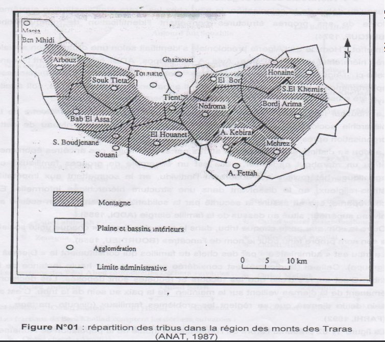 Mac Carthy note que le terme Traras est apparu pour la première fois en 1548. En effet, les différentes sources et écrits qui ont porté sur les Traras montrent que le mot Traras est cité pour la première fois dans le pacte d'alliance passé vers 1548 entre les différentes tribus berbères, afin de lutter contre les espagnols qui venaient de s'installer à Tlemcen (Basset, 1901). Les Traras furent d'abord une confédération de neuf tribus dont la ville de Nedroma constituait le centre de gravité. Ces tribus sont : Béni Mengouch, Msirda Thata et Fouaga, Souahlia, Béni Mishel, Béni Ménir, Béni Khellad, Béni Abed, Béni Ouarsous et Djebala. (Figure N°01) Les Traras sont nés d'une confédération des Koumia. Ces derniers ont habité pendant de longue date le pays entre Tlemcen et Arrechgoul (Rechgoun) (Basset, 1901). Cette tribu des Koumia fut appelée Satforah (Basset, 1901). Ibn Khaldoun disait de son côté, d'après les généalogistes berbères que les Koumia étaient les enfants de Fatan. Ce dernier n'était autre que Tamzit, fils de Zahik, fils de Madghis-El Abter (Basset, 1901). A l'instar des autres espaces montagnards de l'Afrique du Nord, cette identité régionale est marquée d'abord par le milieu physique ensuite par le milieu humain d'origine berbère (Farhi, 1992). Selon Tinthoin en 1960, cette région est sans conteste une aire géographique habitée par une population berbère sédentaire, arabisée peu à peu depuis le Xll ème siècle. Selon ce même auteur, les origines berbères de la population des Traras ne font pas de doute « Là survivent peuplement et toponymies berbères ». Telles sont à notre connaissance, les tribus qui composent la confédération des Traras vivant dans la partie occidentale de l'Oranie Portant le même nom ( Farhi, 1992). Figure N°01 : Répartition des tribus dans la région des monts des traras (A.N.A.T., 1987).