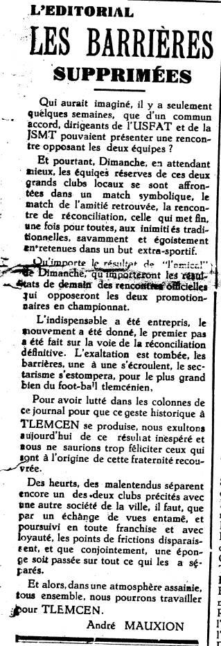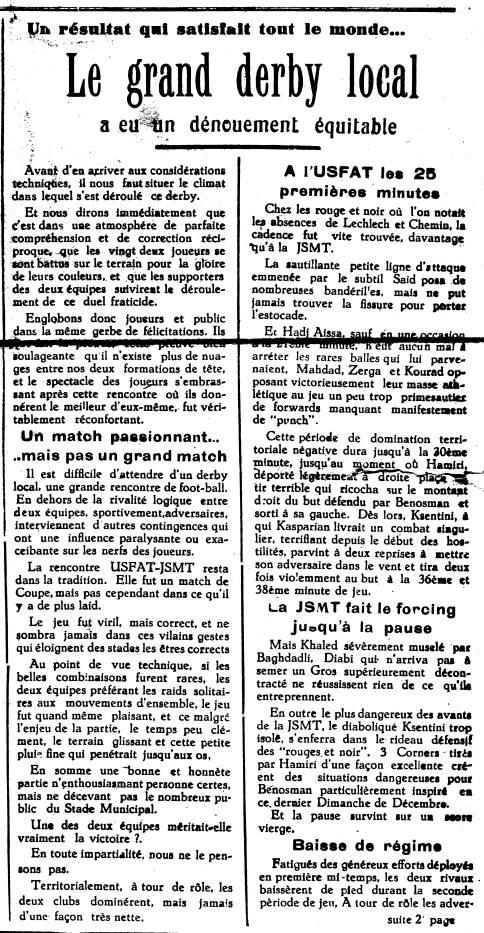 Les autres grands matchs étaient les derbys avec l’autre équipe de la ville, l’USFAT. La rivalité était très vive entre les « blaghdjia » (= savetiers, surnom donné aux supporters de la JSMT) et les « Rouge et Noir ». Les antagonismes étaient profonds et de nombreuses missions de réconciliation ont été menées afin de rapprocher les « frères ennemis ». Voici l’éditorial paru dans l’hebdomadaire sportif local, « Coup Franc » du 3 octobre 1952, signé par le Président de l’USFAT, André Mauxion.